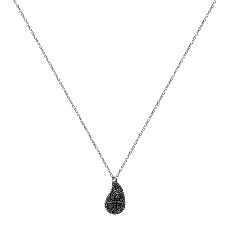 A delicate necklace with a teardrop pendant exudes elegance and simplicity. Silver plated with black rhodium provides the perfect backdrop for the sparkle of black zirconia, reflecting light like stars in the night sky. This piece blends classic beauty with a modern touch, adding mystery and radiance to any look. Perfect for both everyday wear and special occasions.