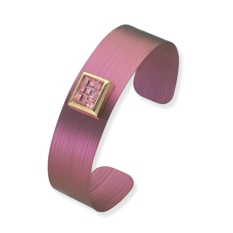 A contemporary bangle bracelet where the raw elegance of titanium meets the soft glow of pink gemstones. The 24K gold-plated silver setting adds a touch of refinement and luxurious contrast. Its clean, structured form highlights modern minimalism, while the interplay of materials makes it an eye-catching piece of timeless style. Perfect worn alone or paired with the matching earrings, ring, and necklace from the same collection.
