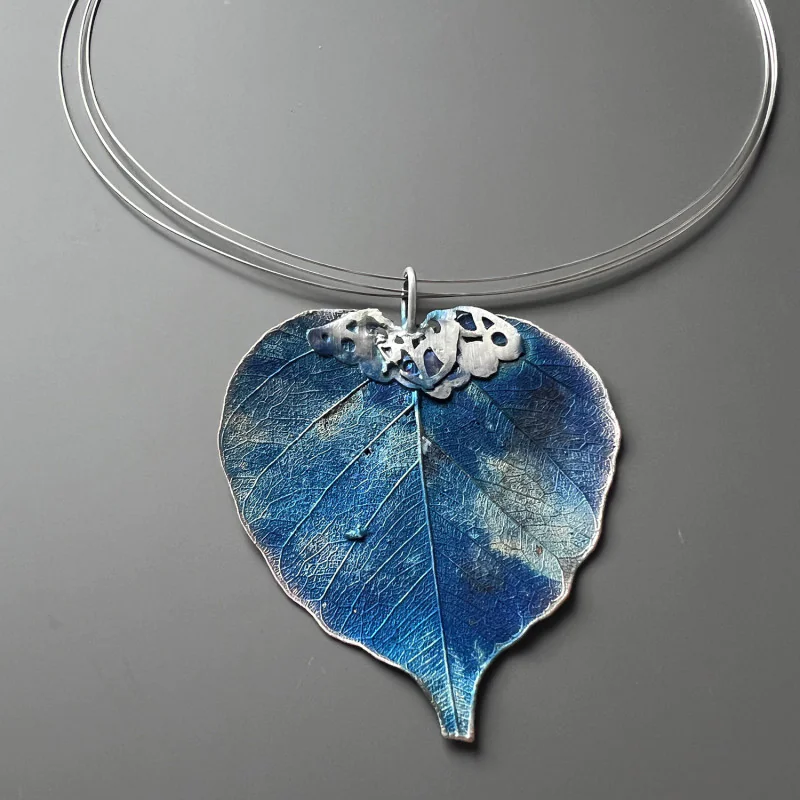 Organic form, intricate structure, timeless elegance. The handcrafted Silver LEAF necklace is a jewelry interpretation of nature, where metal becomes as delicate as plant tissue. Thanks to an advanced, proprietary crafting technique, the pendant faithfully replicates the natural texture and structure of a real leaf, preserving its filigree lightness while captivating with subtle shades of navy blue, sky blue, and silver.