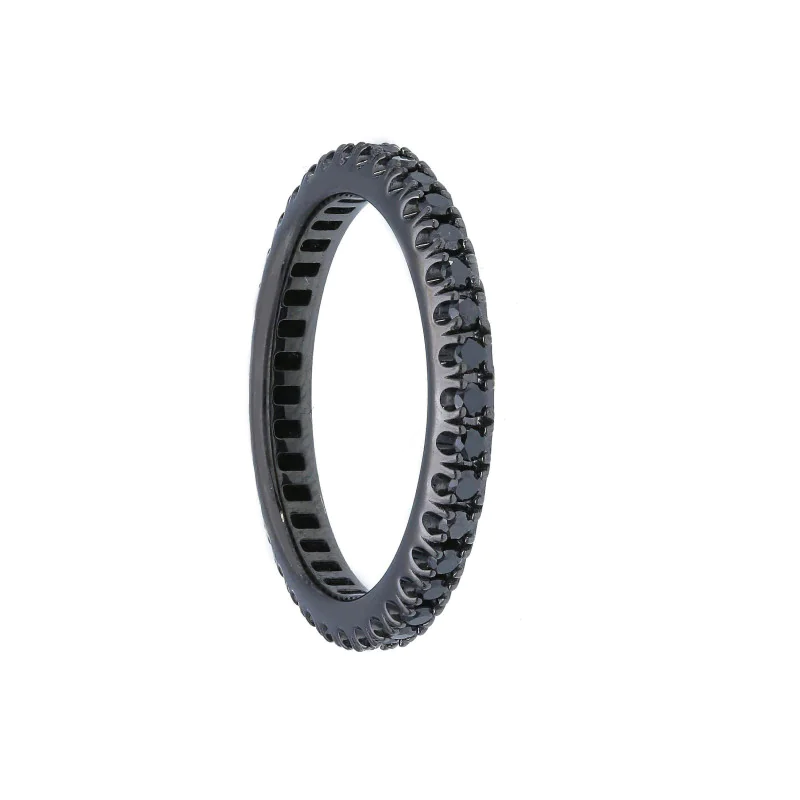 Pure elegance redefined. The Eternity Black Diamond ring captivates with its refined simplicity and depth of tone. Crafted from 18ct gold (750 fineness) and finished with black rhodium, it radiates a mysterious, sensual glow. Each black diamond, meticulously set in a continuous rhythm, forms an endless circle of luxury and balance. A piece that merges modern minimalism with the timeless symbol of eternity — made for those who seek understated yet confident beauty.