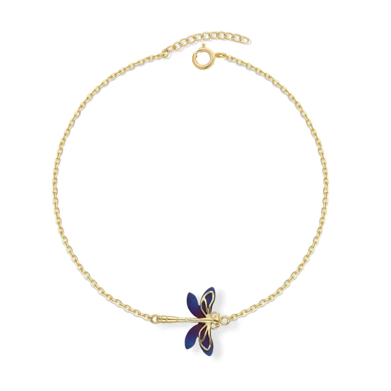 A subtle bracelet featuring a titanium dragonfly motif — elegant in its minimalist form. The shimmering wings seem touched by light, while the gold-plated silver adds warmth and sophistication. A poetic design that perfectly complements the matching necklace and earrings.