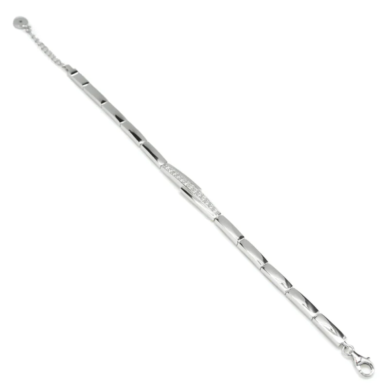 Stylowa bransoletka o sztywnej, eleganckiej formie, wykonana ze srebra i ozdobiona cyrkoniami. Idealnie dopełnia kolię z tej samej kolekcji, tworząc zestaw pełen klasy i blasku. Delikatna, a zarazem wyrazista – idealna dla kobiet ceniących nowoczesną elegancję w klasycznym wydaniu.
