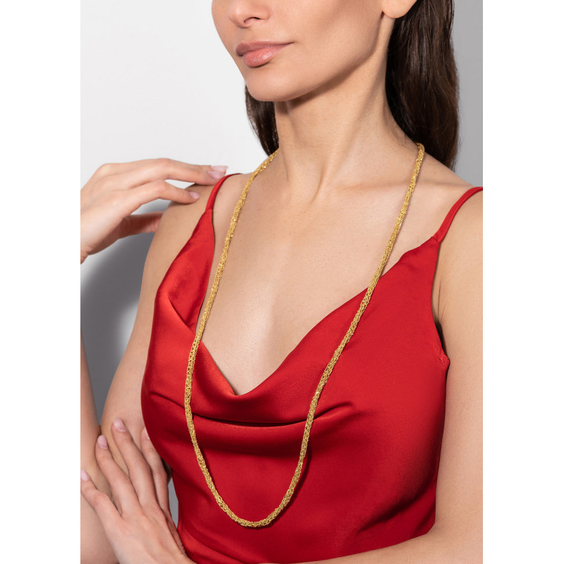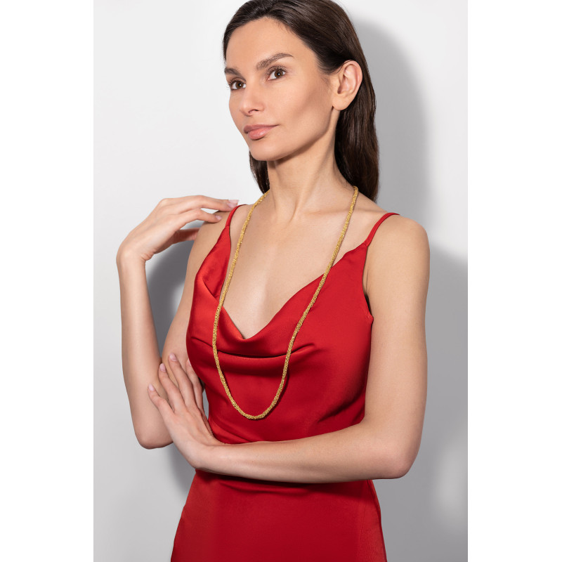 Naszyjnik Luxe Long, wykonany ręcznie, na szydełku, z cienkich srebrnych łańcuszków, tworzy efekt lekkiego, eterycznego sznurka, który zyskuje spektakularny blask dzięki pozłoceniu. Minimalistyczny, ale z wyjątkowym charakterem, doskonale pasuje do codziennych i wieczorowych stylizacji. Autorskie magnesowe zapięcie ze srebra zapewnia komfort noszenia i łatwość zakładania. Możesz nosić na wiele sposobów: jako długi naszyjnik do sukienki czy białej koszuli, lub owinięty wokół szyi dwa razy - jako krótki podwójny naszyjnik, a także z supełkiem. Możesz dowolnie miksować z innymi kolorami z kolekcji lub dołożyć krótki naszyjnik w innym odcieniu. Możesz bez końca tworzyć różne wariacje stylistyczne. Idealny dodatek dla osób, które cenią minimalizm, ale nie rezygnują z artystycznego charakteru.