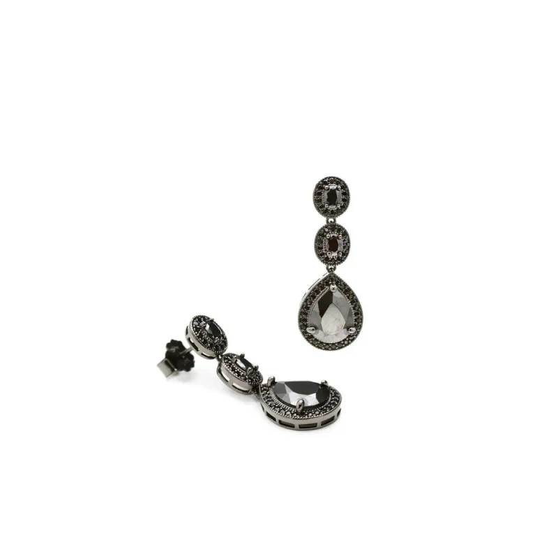 Trzyelementowe kolczyki o zmysłowej linii, wykonane ze srebra pokrytego czarnym rodem. Każdy segment lśni czarnymi cyrkoniami, a całość zwieńczona jest cyrkonią w kształcie kropli – niczym kropla nocnego światła. Ich forma łączy nowoczesną elegancję z hiszpańskim temperamentem, tworząc biżuterię pełną blasku, tajemnicy i wyrafinowanego magnetyzmu. Idealne do wieczorowych stylizacji, ale także jako odważny akcent w codziennym wydaniu.
