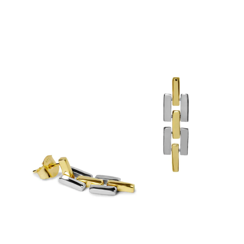 Srebrne kolczyki z pozłacanymi elementami to połączenie subtelności i nowoczesnej elegancji. Geometryczna forma inspirowana strukturą ogniw tworzy harmonijny rytm światła i koloru. Wykonane na tradycyjnych sztyftach, zachwycają lekkością i precyzją wykończenia. Idealne na co dzień i na wyjątkowe okazje – emanują klasycznym wdziękiem w nowoczesnym wydaniu.