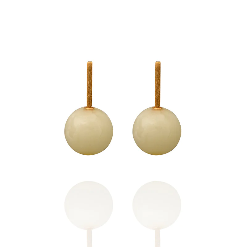 Kolczyki Josei autorstwa Macieja Rozenberga to wyrafinowana interpretacja minimalistycznej formy, w której liczy się harmonia proporcji i szlachetność materiałów. Smukłe, pionowe elementy wykonane z pozłacanego srebra subtelnie prowadzą wzrok ku centralnemu akcentowi – idealnie gładkiej kuli z bursztynu w naturalnym, jasnomlecznym odcieniu.