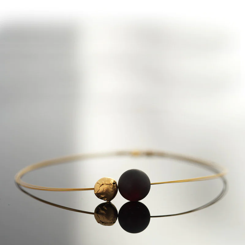 Naszyjnik Dulcis Girocollo autorstwa Macieja Rozenberga to subtelna, współczesna forma podkreślająca naturalne piękno bursztynu bałtyckiego. Delikatna, pozłacana obręcz ze srebra oplata szyję, eksponując kompozycję kulistych elementów o zróżnicowanej fakturze i kolorze. Ręcznie wykonany, łączy minimalistyczną elegancję z organiczną lekkością materiału. To biżuteria, która przyciąga uwagę swoją prostotą i wyrafinowanym detalem.